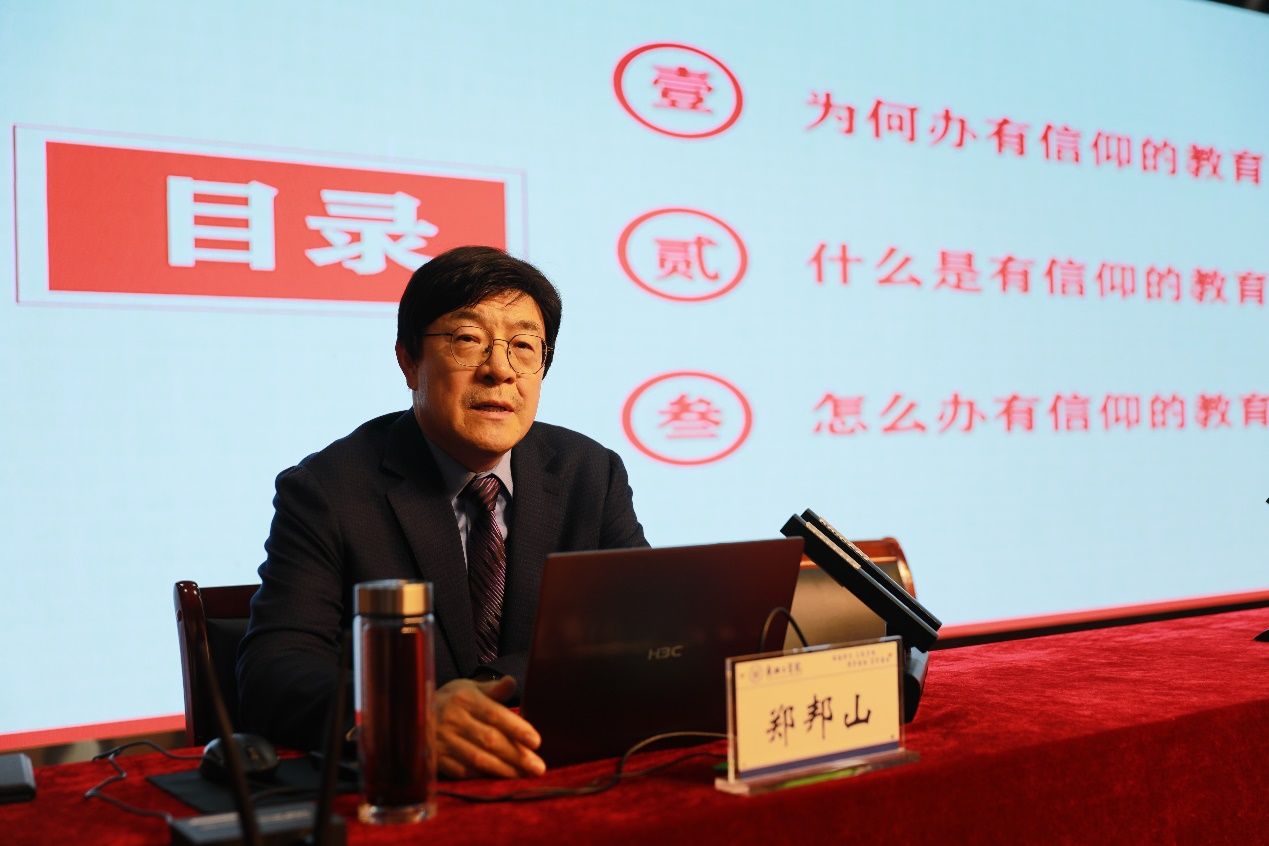 郑邦山以《落实立德树人根本任务 努力办有信仰的教育》为题,从为何办有信仰的教育、什么是有信仰的教育、怎么办有信仰的教育三方面,结合自身工作经历以及河南省高等教育实际进行讲授。他强调,要深入学习贯彻习近平总书记关于教育的重要论述,牢记教育是国之大计、党之大计,坚决落实立德树人根本任务,办有信仰大学、做有信仰老师、育有信仰人才、筑有信仰未来,推动学校各项事业高质量发展。